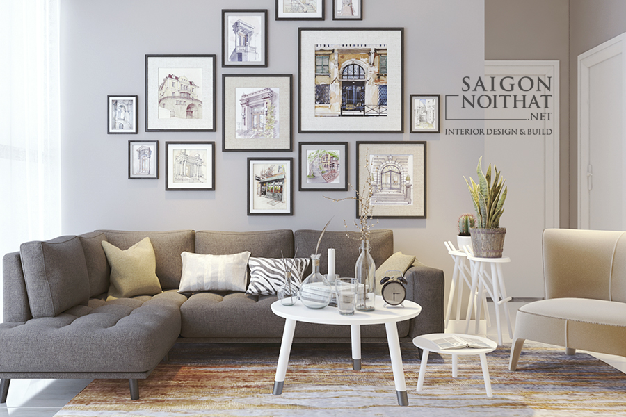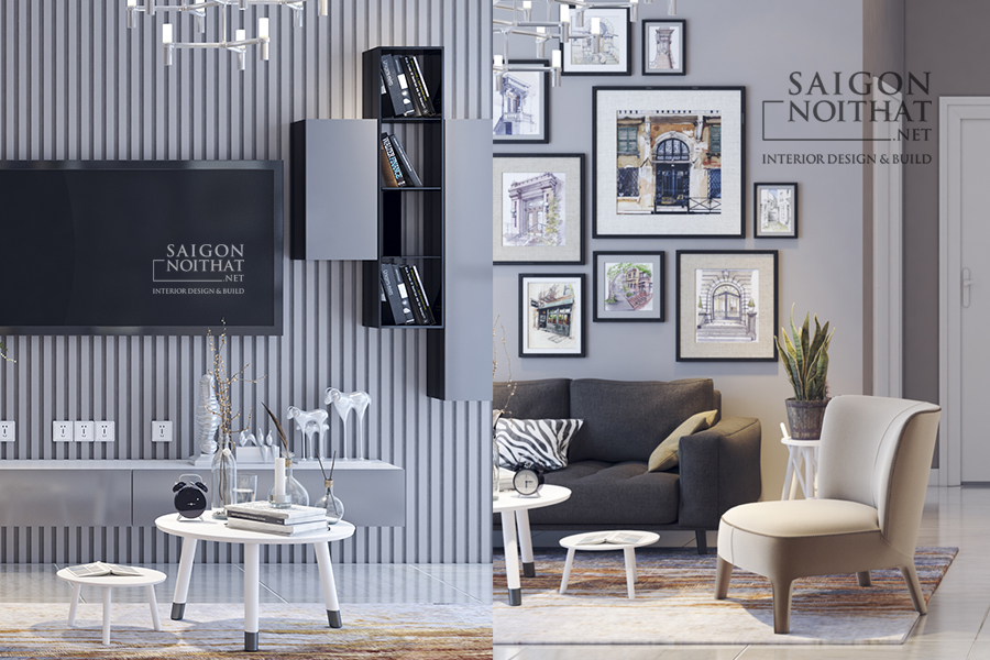Mảng tường tivi được ốp những thanh gỗ dọc sơn xám, bức tường sau sofa lại được trang trí với một bộ tranh màu nước nghệ thuật, cả 2 kết hợp với nhau giúp không gian phòng khách vừa ấm cúng sang trọng, vừa hiện đại nhưng lại pha một chút chất nghệ sỹ của gia chủ.